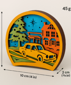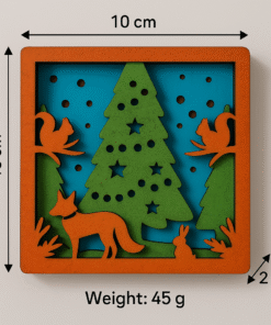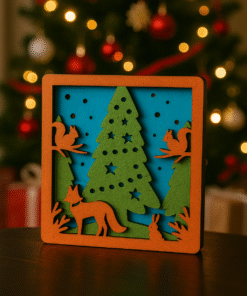 Bring festive charm into your home with this beautifully crafted Christmas Woodland Shadow Box, a delightful decorative piece that captures the magic of the holiday season. This compact 10 cm x 10 cm shadow box features an enchanting layered laser-cut scene showcasing a majestic Christmas tree adorned with stars and ornaments, surrounded by charming woodland creatures including a fox, rabbits, and playful squirrels. The vibrant colour palette of orange, green, and blue creates a captivating visual depth that draws the eye and adds warmth to any space. Weighing just 45 grams with a depth of 2 cm, this lightweight decorative accent is perfect for displaying on shelves, side tables, mantels, windowsills, or in children’s rooms. The intricate layered design creates beautiful shadows and dimension, making it a stunning focal point that celebrates both nature and the festive spirit. Whether you’re decorating your own home for Christmas or searching for a thoughtful gift, this woodland shadow box brings a touch of whimsical seasonal joy that can be treasured year after year. Its compact size makes it ideal for smaller spaces whilst still delivering maximum visual impact.
