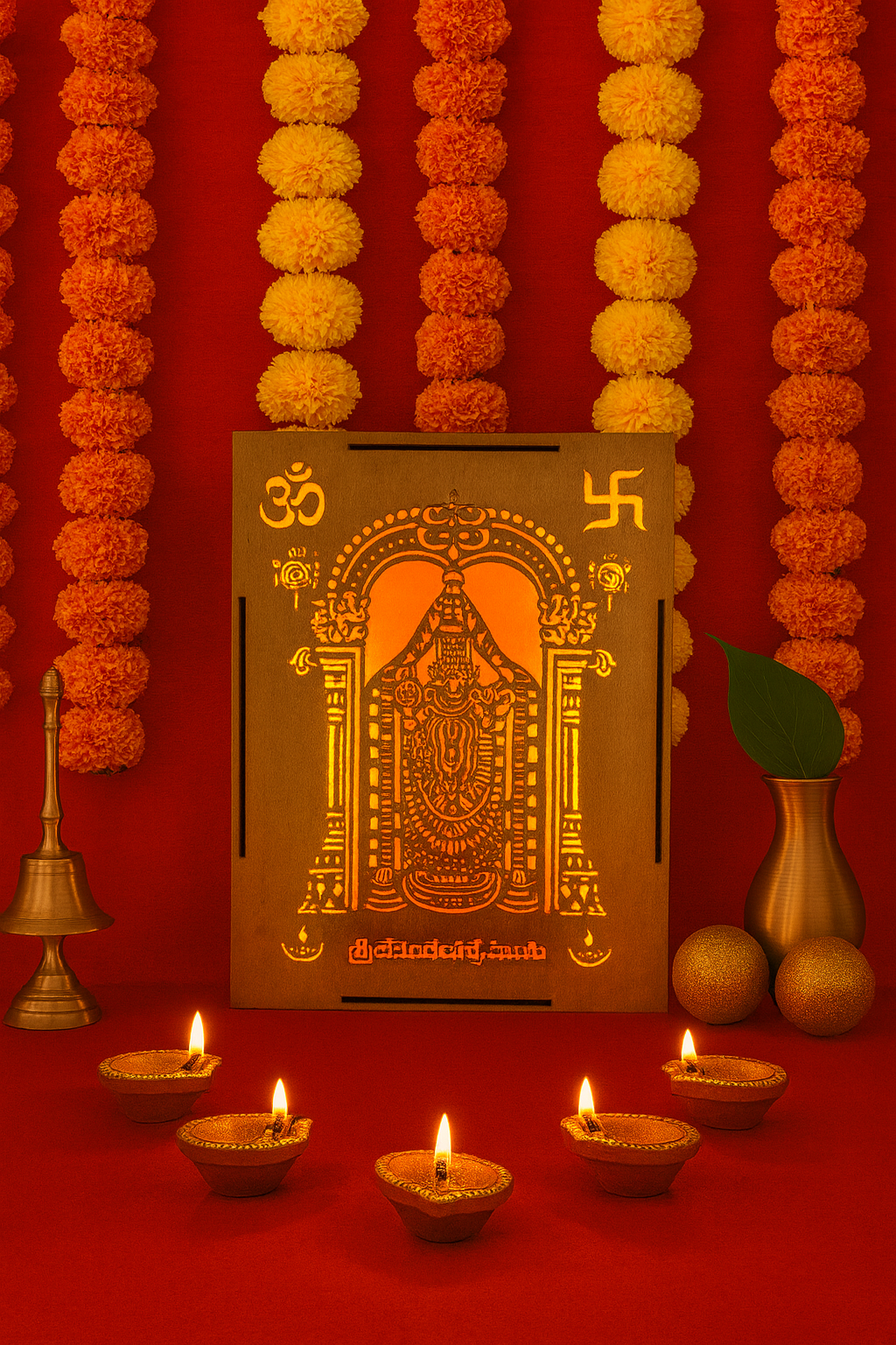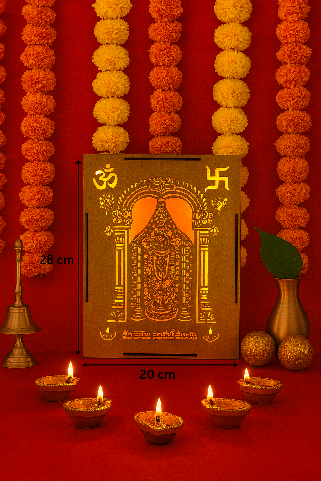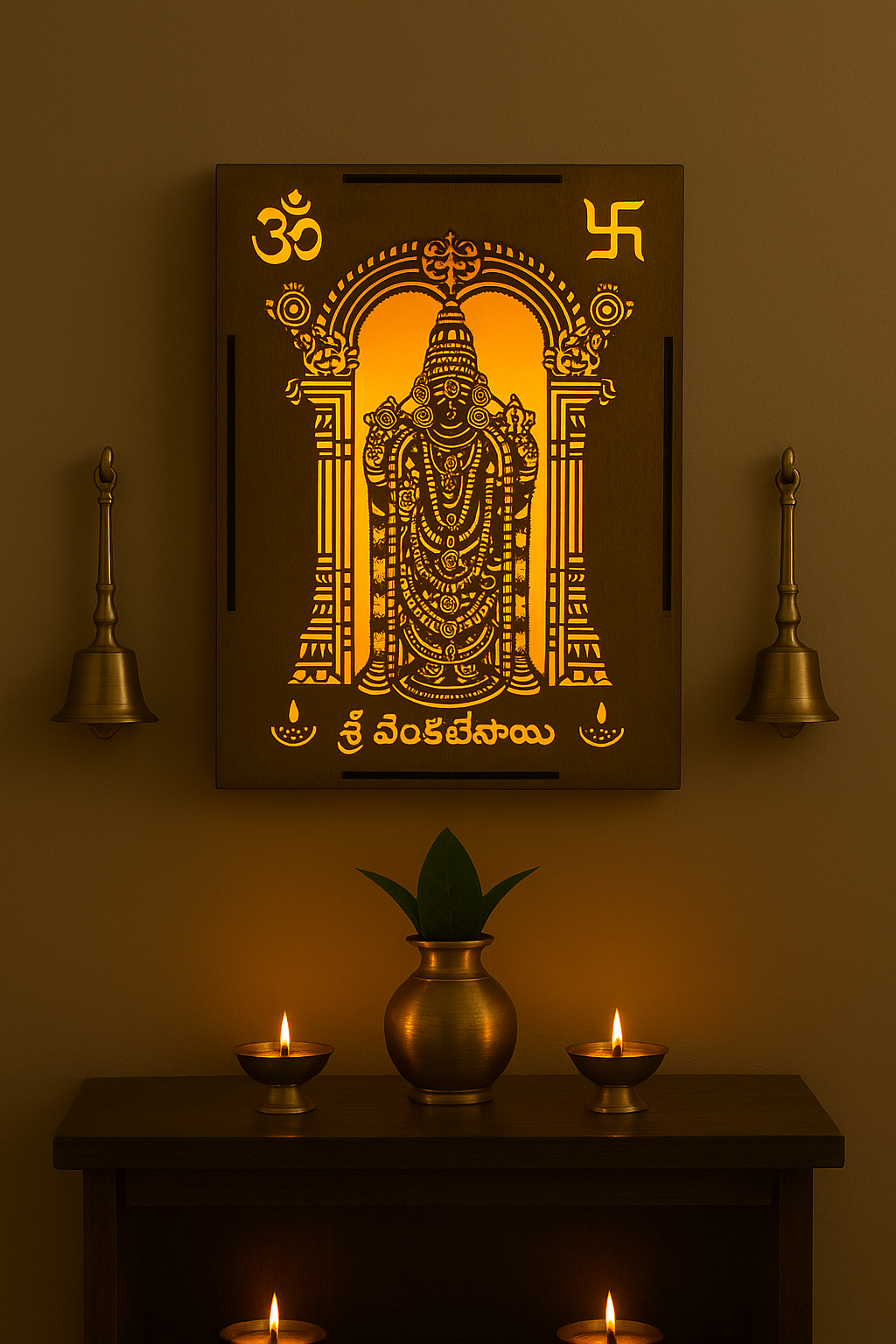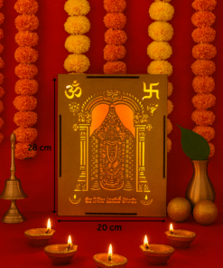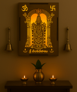 Transform your sacred space with this exquisite Wooden Backlit Shri Venkateswara Wall Hanging from Divine Crafts. This premium laser-cut design features the revered deity in intricate detail, beautifully illuminated by gentle LED backlighting that creates a warm, divine ambience in any room. The sacred Om and Swastik symbols adorn the top corners, enhancing its spiritual significance. Measuring 28cm × 20cm × 3cm and weighing just 300g, this elegant wall hanging is perfectly sized for pooja rooms, mandirs, hallways or living spaces. The soft golden glow radiating through the artistic cutwork creates a tranquil devotional atmosphere, making it an ideal centrepiece for your home temple. Crafted with precision and devotion, this wall hanging serves as both a stunning decorative piece and a meaningful spiritual focal point that brings serenity and divine grace into your home.