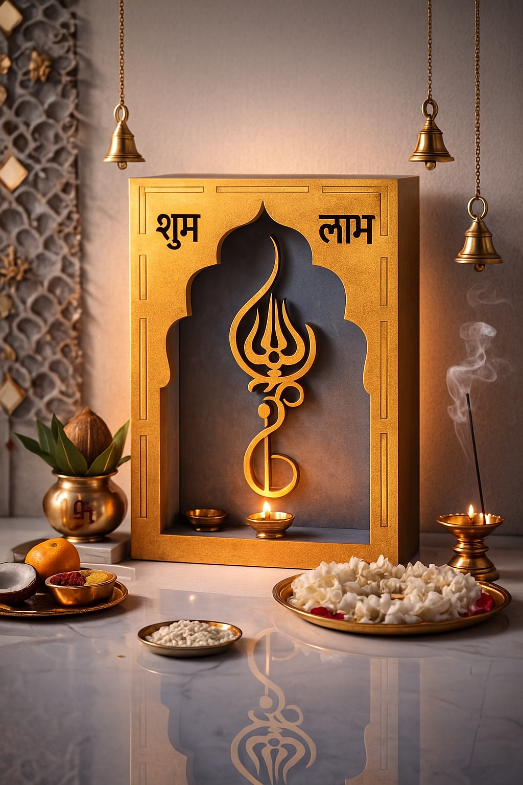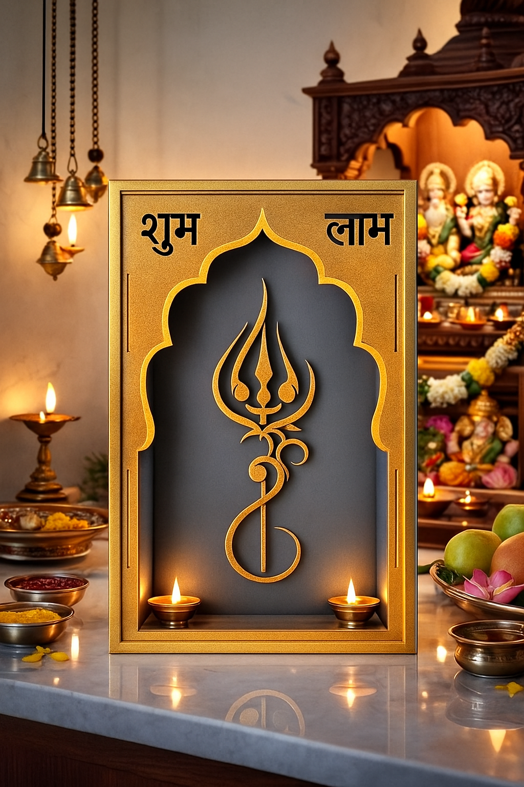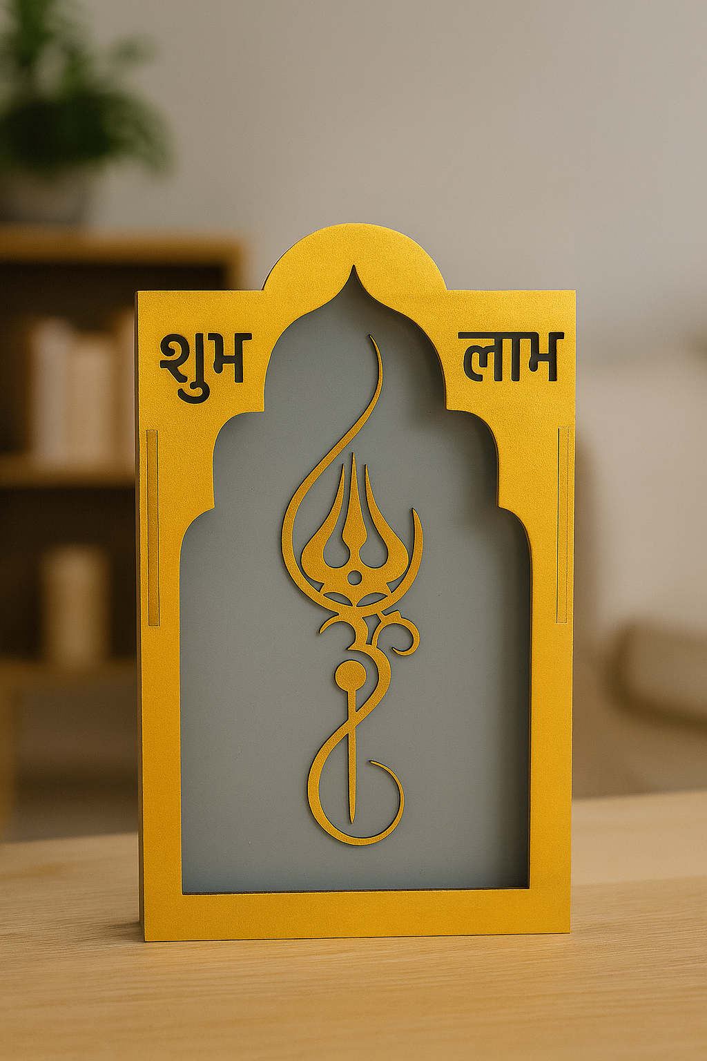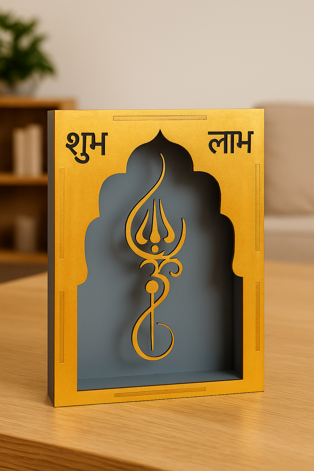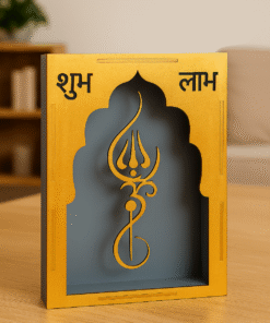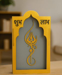 Bring prosperity, positivity, and divine elegance into your space with this beautifully crafted Shubh Labh Trishul Decorative Frame. Designed in a premium golden finish with a temple-style arch silhouette, this piece combines traditional symbolism with modern aesthetics—perfect for any contemporary Indian home. Featuring laser-cut Shubh and Labh inscriptions along with an intricately carved Trishul symbol, this décor represents blessings, good fortune, and spiritual protection. The contrasting backdrop adds depth and visual appeal, making it suitable for wall mounting or tabletop placement. Measuring 26 cm in height, 15 cm in width, and 8 cm in depth, this lightweight 288-gram frame fits seamlessly into various spaces without overwhelming your décor. Whether displayed at the entrance, pooja room, living area, office reception, or shop counter, it instantly enhances the atmosphere with auspicious charm. This decorative frame makes an excellent gift for housewarmings, Diwali, weddings, or any festive occasion, bringing divine blessings to your loved ones’ homes.