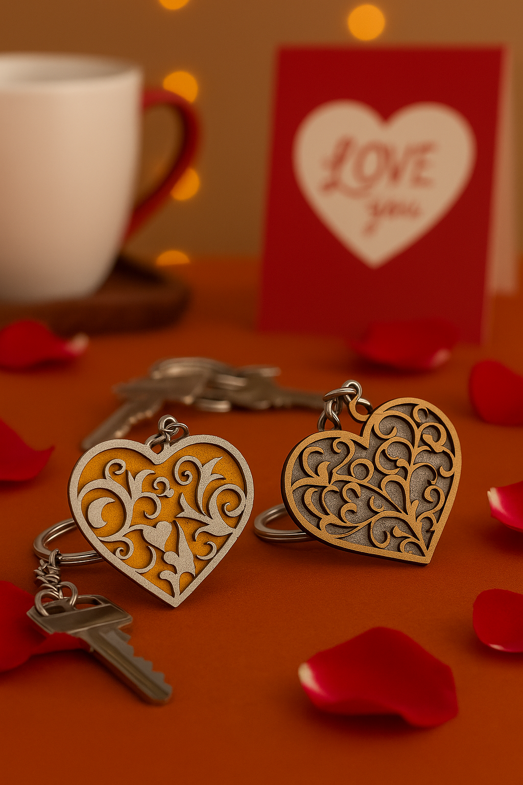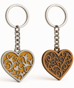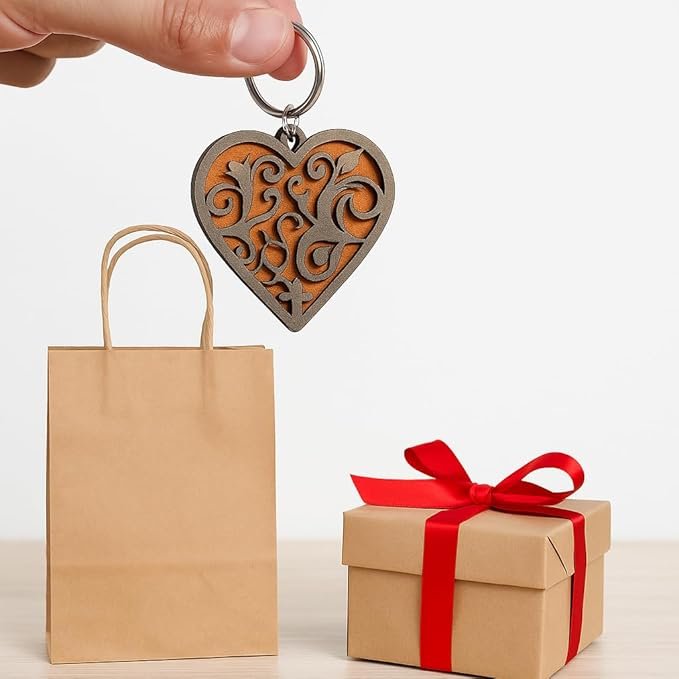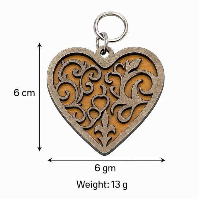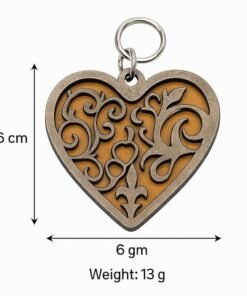 Elevate your everyday essentials with this exquisite handcrafted wooden heart keychain. Meticulously laser-cut from premium 5mm MDF, this charming accessory showcases an intricate layered scrollwork pattern that creates a stunning 3D effect in beautiful brown and gold tones. Measuring a convenient 6 cm x 6 cm and weighing just 13 grams, it’s the ideal size for daily use while making a sophisticated style statement. The detailed artistry overlaid on a vibrant background demonstrates exceptional craftsmanship, making each piece a miniature work of art. The durable construction ensures it withstands daily use while keeping your keys organised in style. This elegant heart keychain makes for a meaningful gift choice on special occasions, adding a touch of romance and sophistication to any key ring. The smooth finish and precise detailing reflect premium quality, while its lightweight design ensures comfortable carrying in pockets or bags. Perfect for those who appreciate functional accessories with artistic flair.
