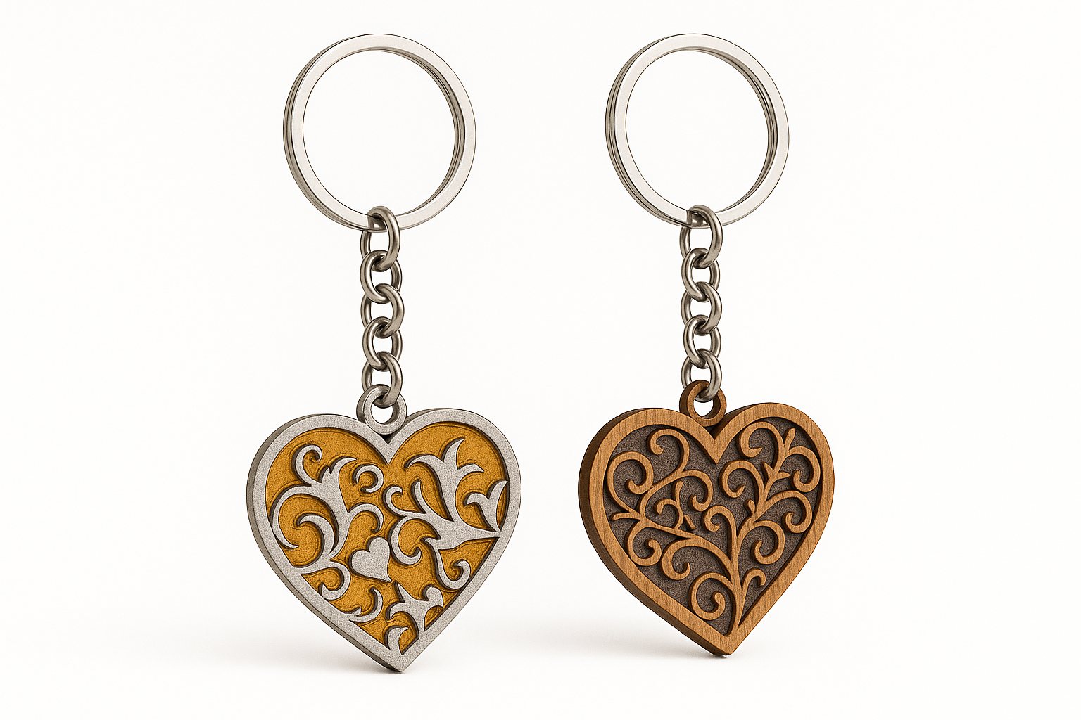 Wooden Heart Keychain, Handcrafted Laser-Cut MDF, Intricate Layered Pattern, 6 cm x 6 cm, Brown and Gold, 3D Effect Scrollwork Design