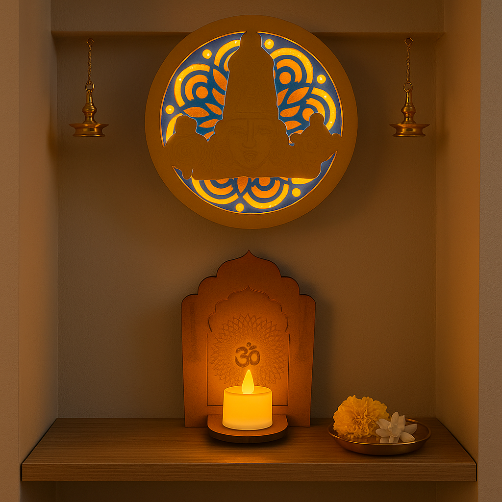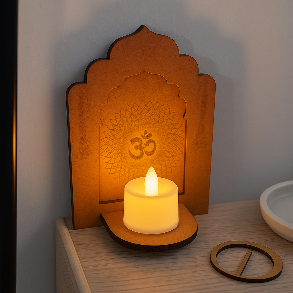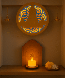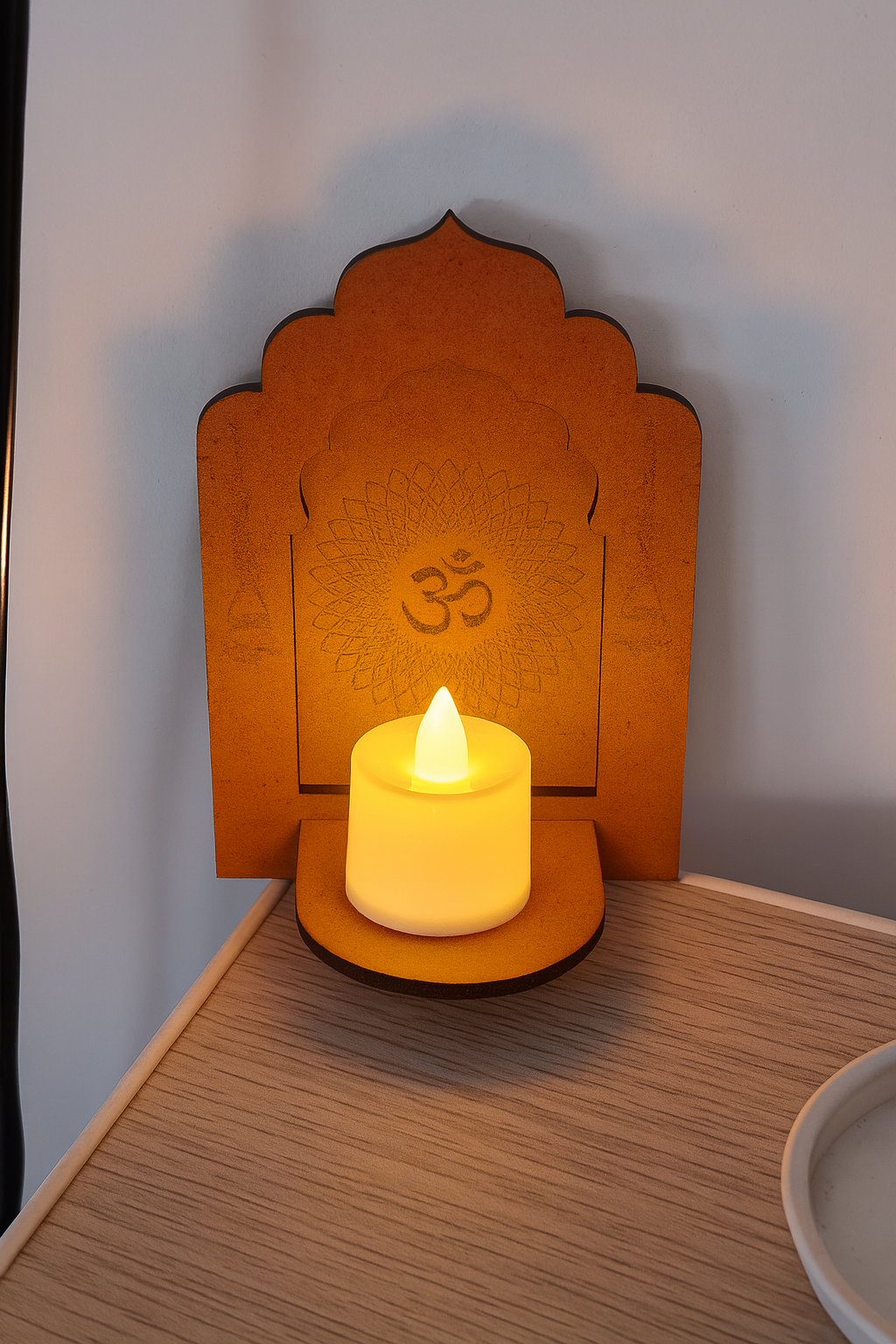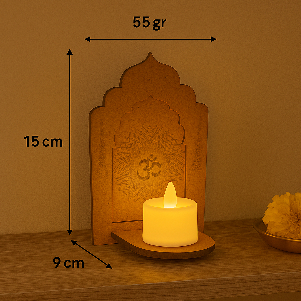 This beautifully handcrafted Wooden OM Tea Light Holder brings serenity and divine energy into your home. Featuring an intricately engraved mandala pattern with the sacred ॐ (Om) symbol, this elegant piece creates a peaceful ambience perfect for pooja rooms, meditation corners, or any spiritual space. The temple-style arch design with its layered silhouette adds a touch of traditional charm to modern homes. Measuring 15 cm in height, 9 cm in depth, and 55 grammes in weight, this compact décor piece fits beautifully on tabletops, shelves, or altars without occupying much space—ideal for apartments and minimal pooja areas. The warm LED candle included provides safe, smokeless illumination that’s perfect for daily rituals and prayer sessions. Unlike traditional candles, the LED light offers worry-free operation with no flame or wax mess. This lightweight yet durable wooden holder serves as both a functional light source and a stunning spiritual accent piece. Whether you’re setting up your meditation space, enhancing your pooja room, or looking for a thoughtful gift during festivals, this OM tea light holder brings divine charm and tranquil lighting to any setting.